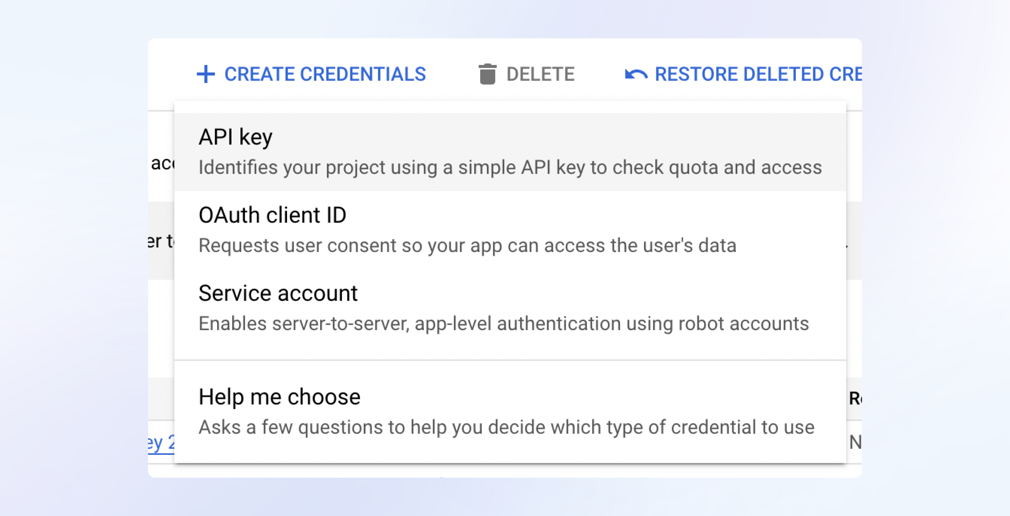Перейдите на панель credentials и нажмите на кнопку «CREATE CREDENTIALS». В выпадающем списке выберите пункт «API key».
