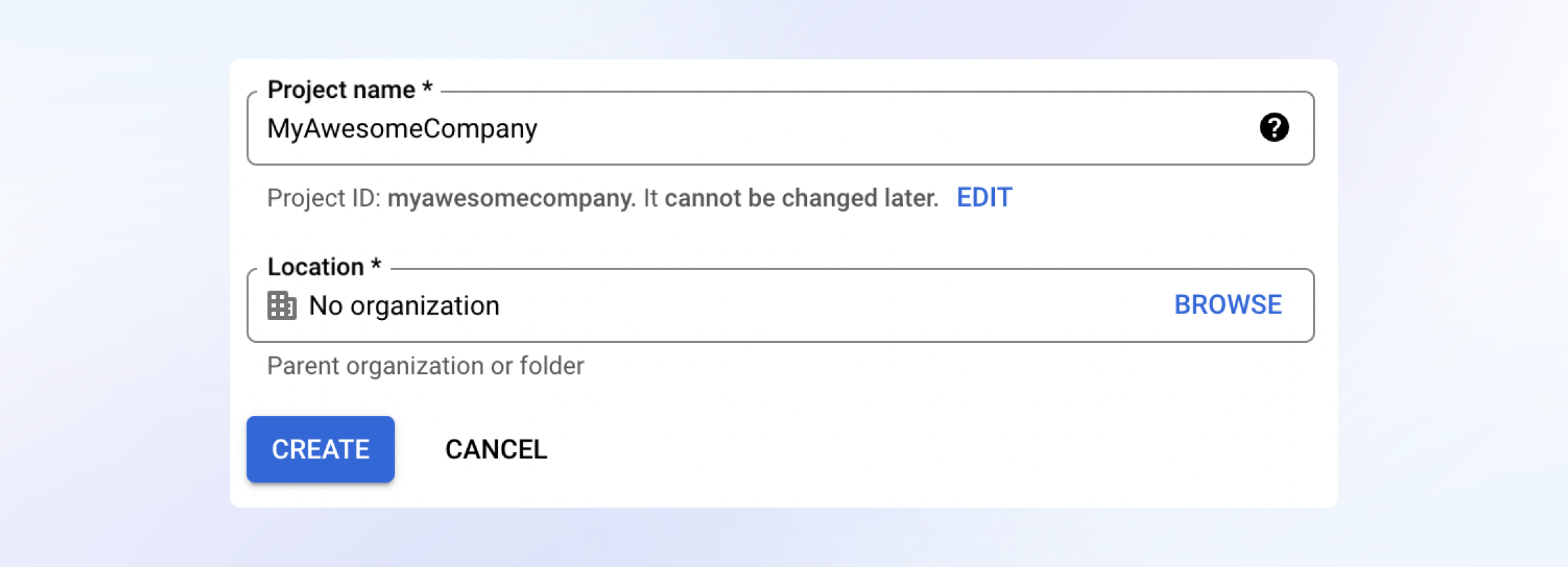 Заполните открывшуюся форму данными. В качестве значения «Project Name» введите имя проекта латиницей (имя может быть произвольным).
