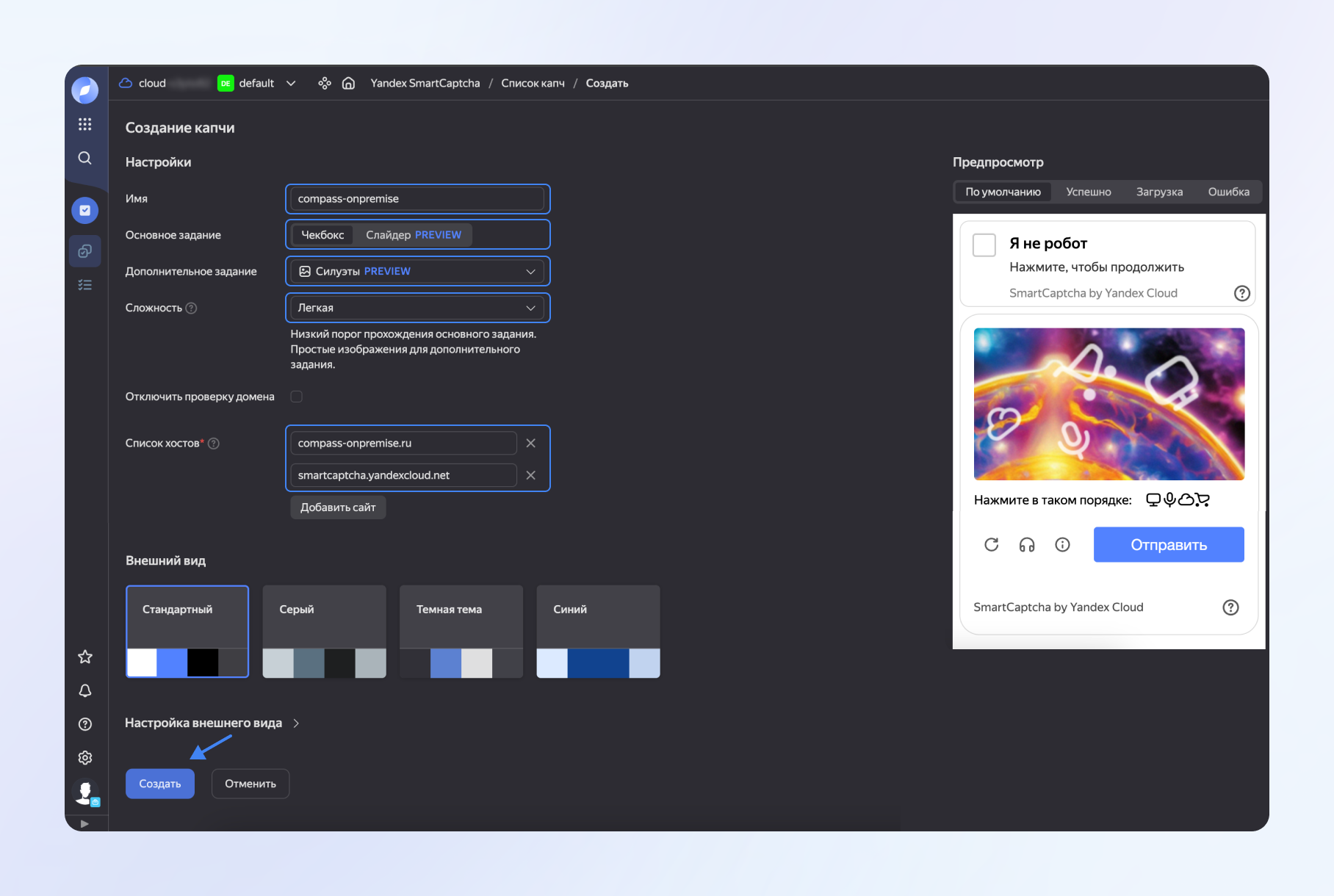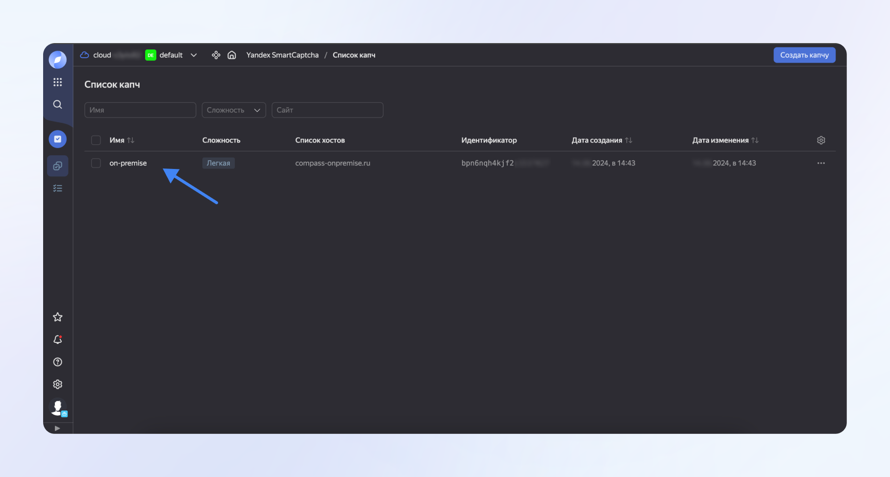 в поле «Список хостов» необходимо указать: <ваш Compass On‑premise домен> и домен «smartcaptcha.yandexcloud.net».