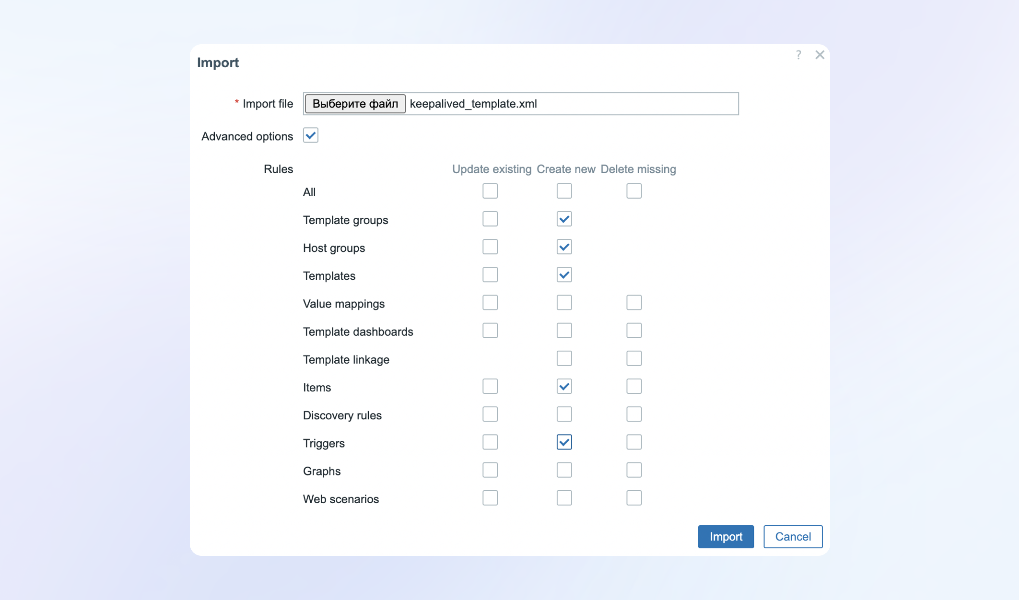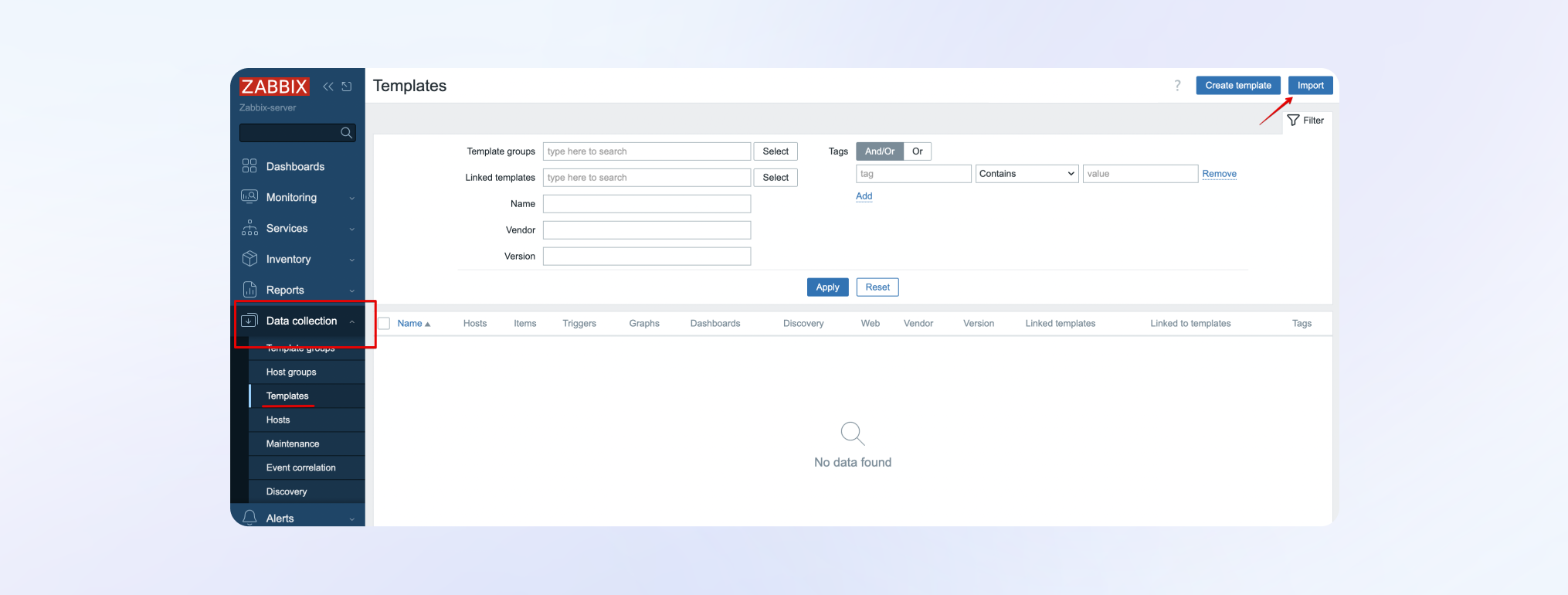 В панели администратора в разделе «Data collection» (в старых версиях — «Configuration») откройте вкладку «Templates». Далее нажмите на кнопку «Import».