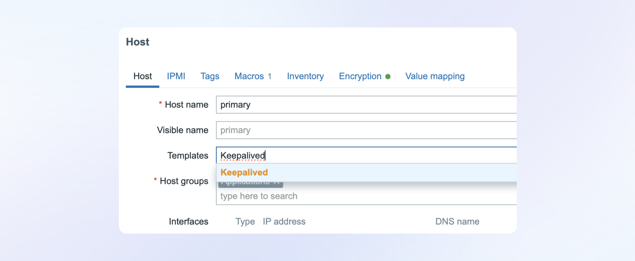В окне хоста в строке «Templates» для выделенного хоста введите «Keepalived», выберите предоставленный шаблон.
