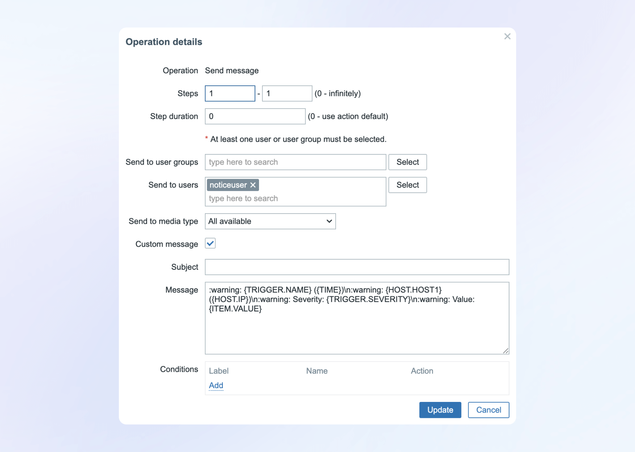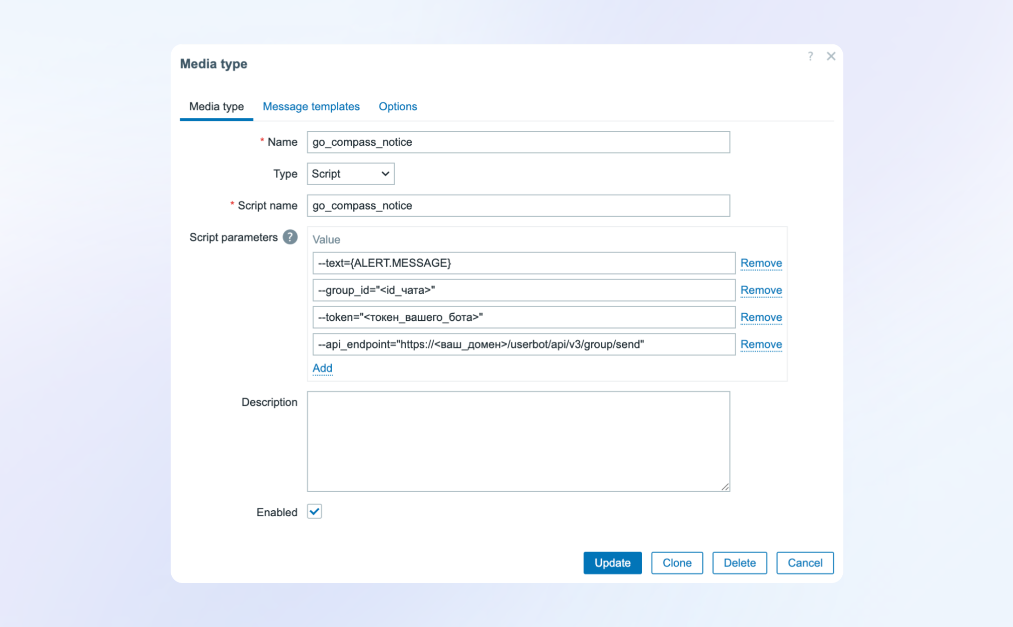 Script parameters:text - текст сообщения при отправке уведомления с Zabbix-сервера.