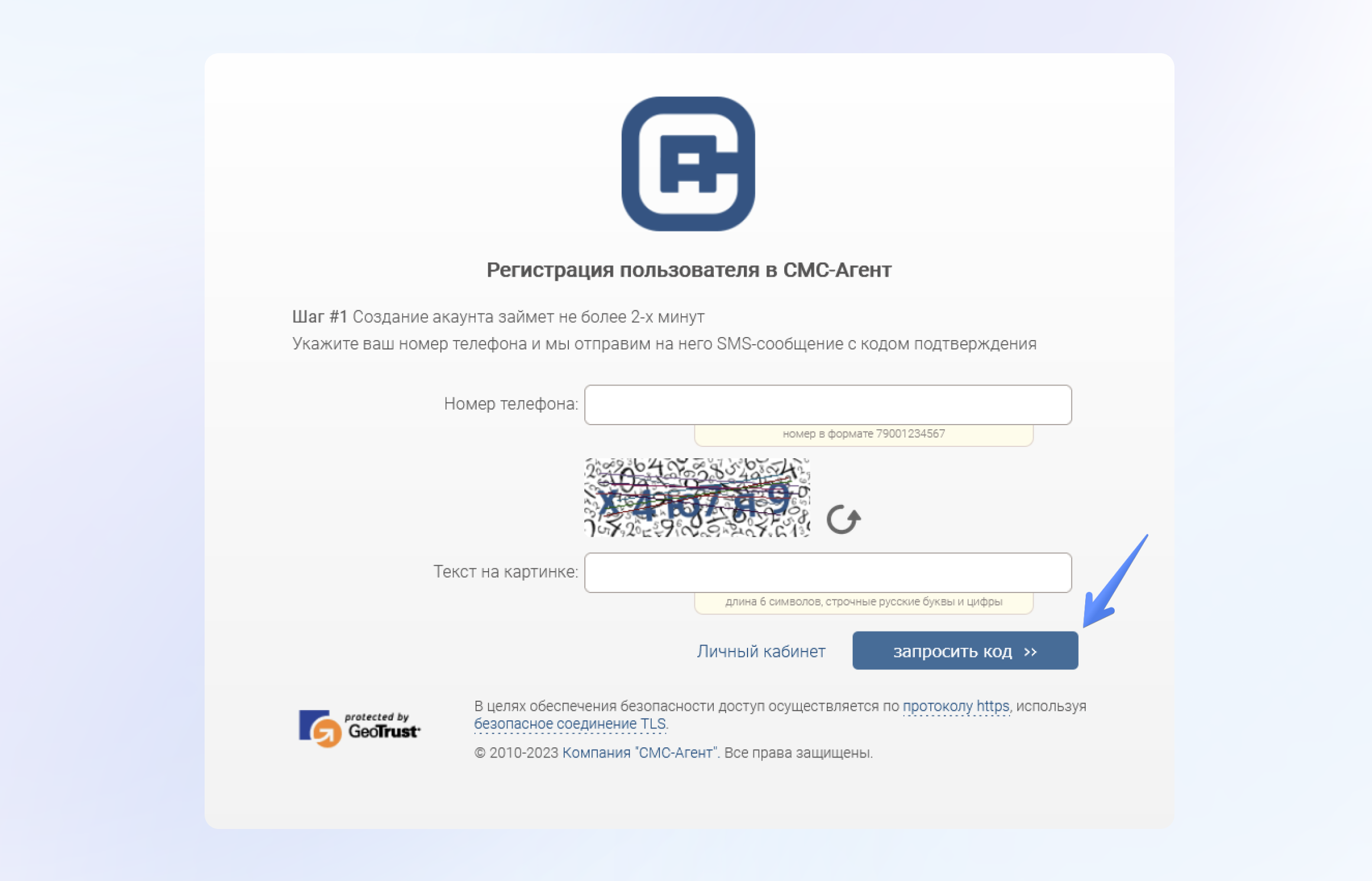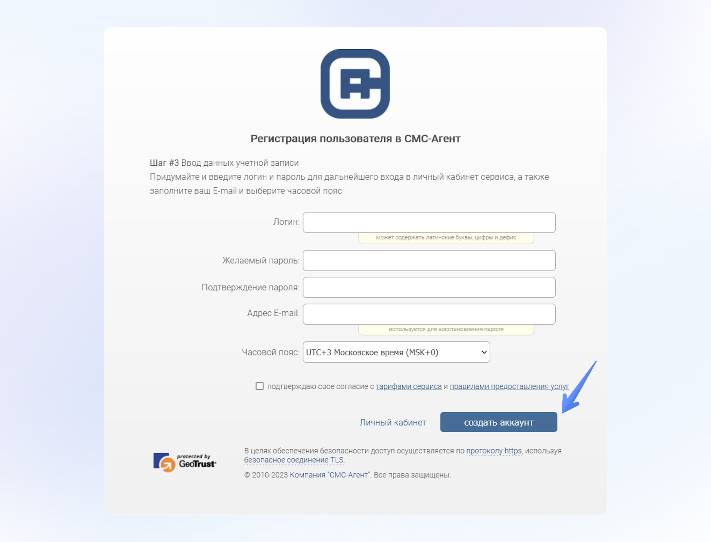 Перейдите на страницу регистрации сервиса СМС-Агент и заполните все необходимые поля.