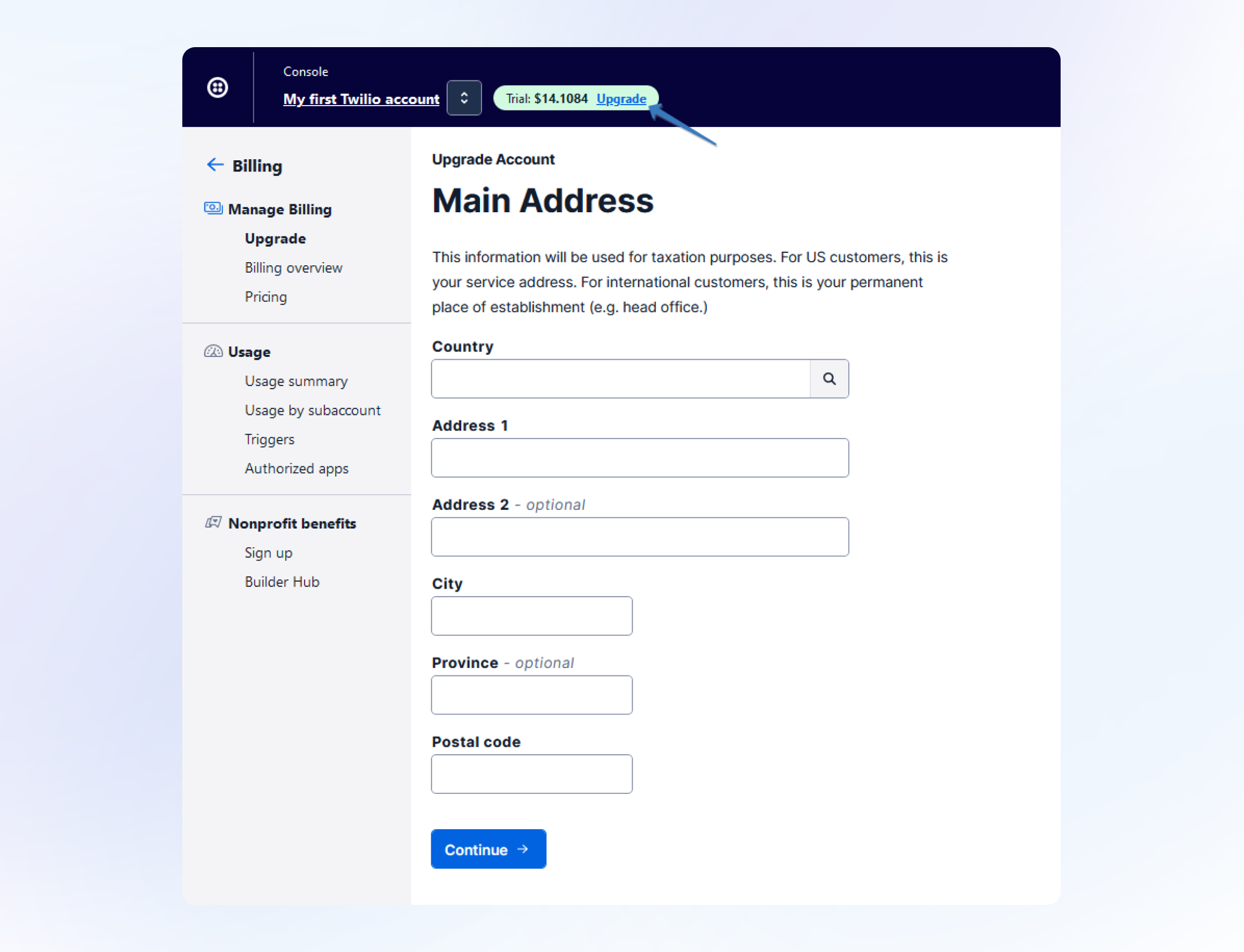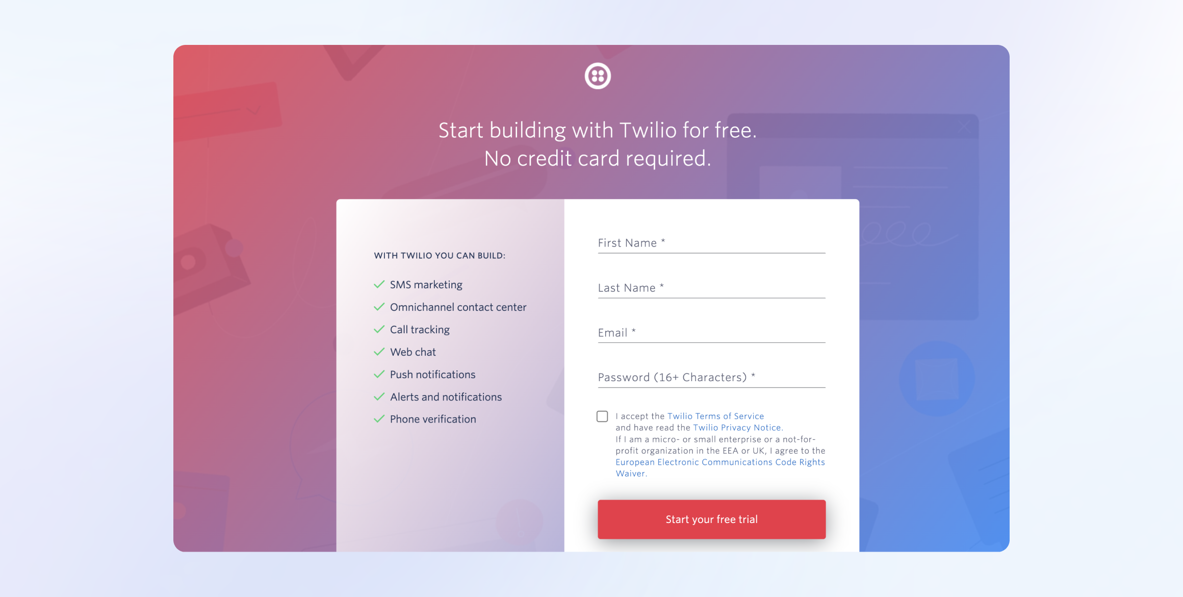 Подтвердите личный номер телефона. Номер будет использоваться для получения тестовых сообщений от Twilio в пробном режиме.