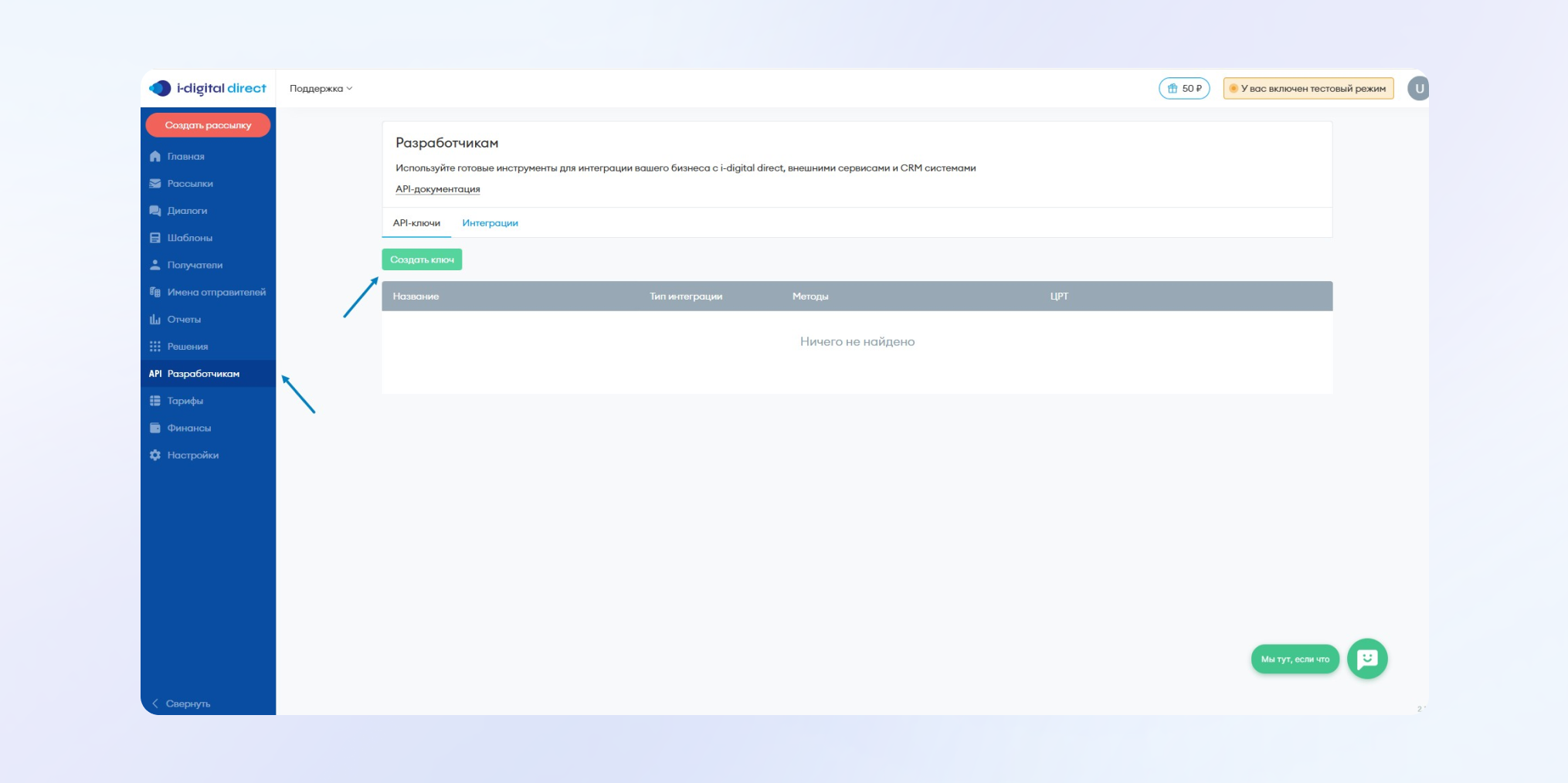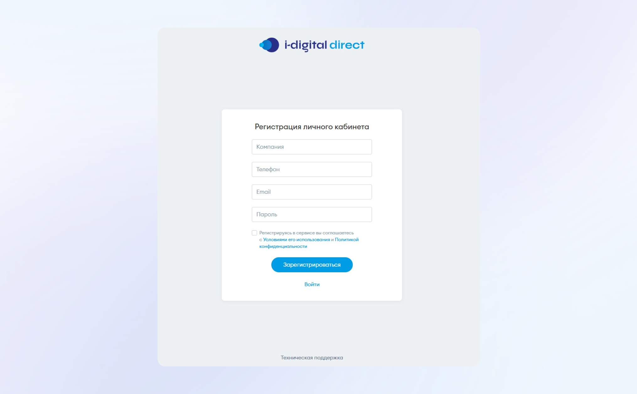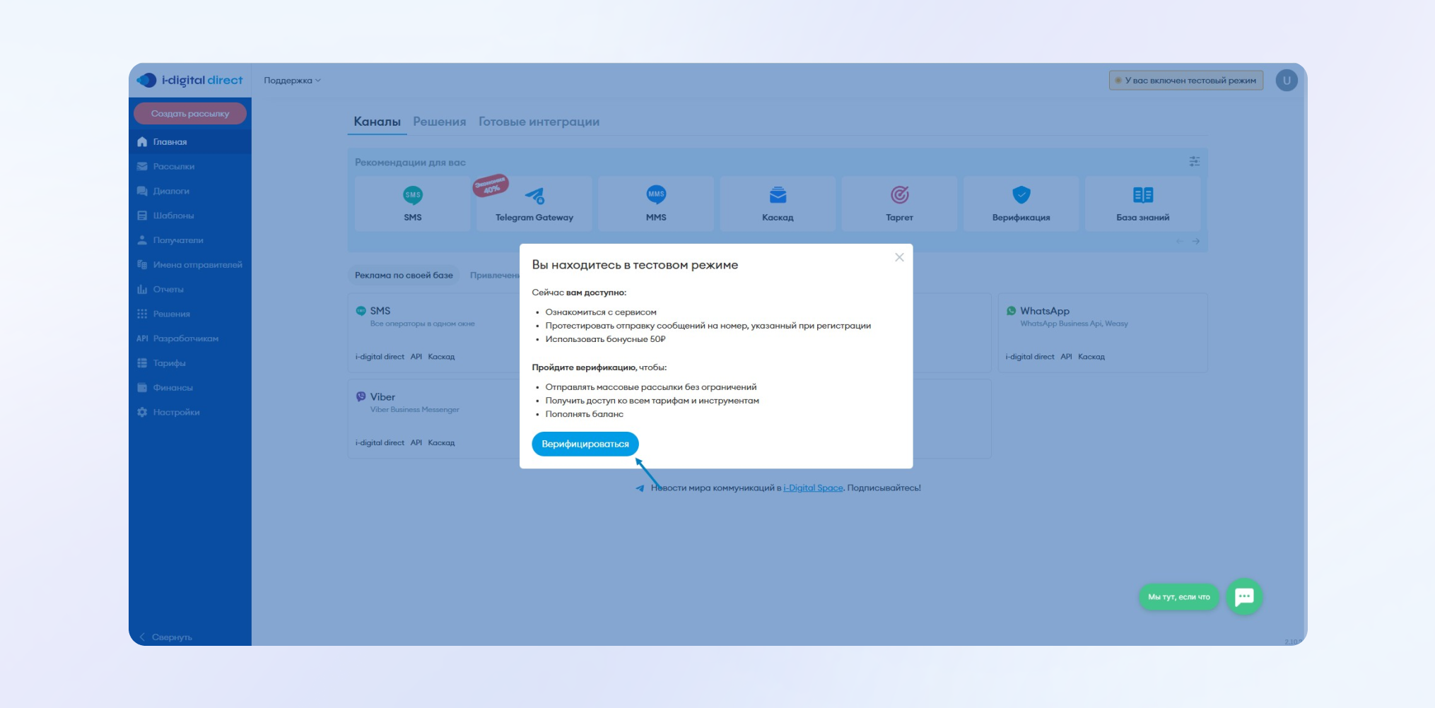 После завершения регистрации откроется главная страница i-Digital. После регистрации вам будет начислена бонусная сумма, которую можно потратить на тестирование отправки сообщений.