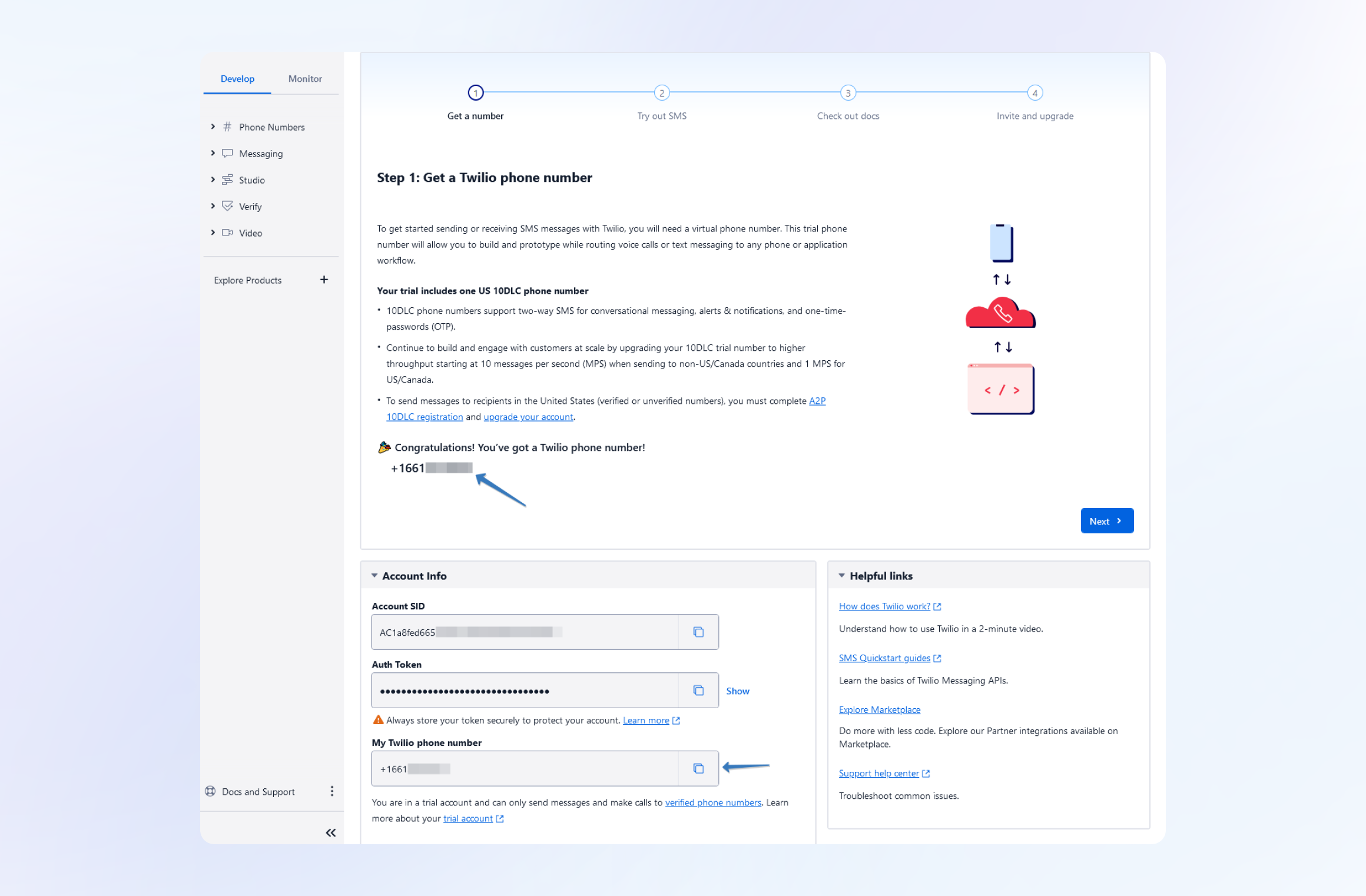 Для отправки тестового SMS вам необходимо получить пробный номер телефона.