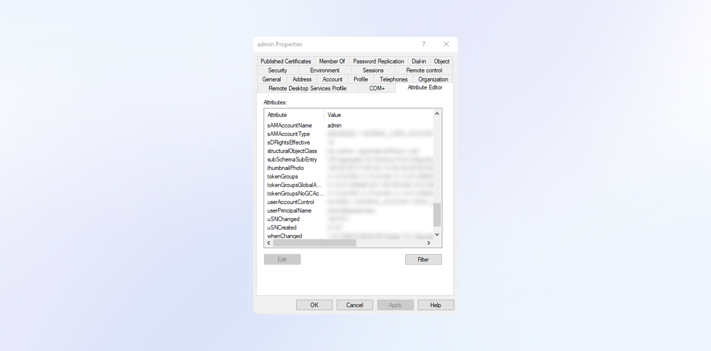 Для просмотра атрибутов учетных записей перейдите в нужную директорию, выберите пользователя, щелкните правой кнопкой мыши по объекту, выберите «Properties», затем откройте вкладку «Attribute Editor».