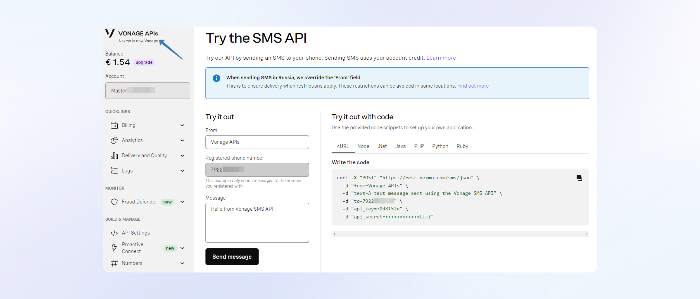 Шаг 5: Получение необходимых данных в личном кабинете Vonage¶