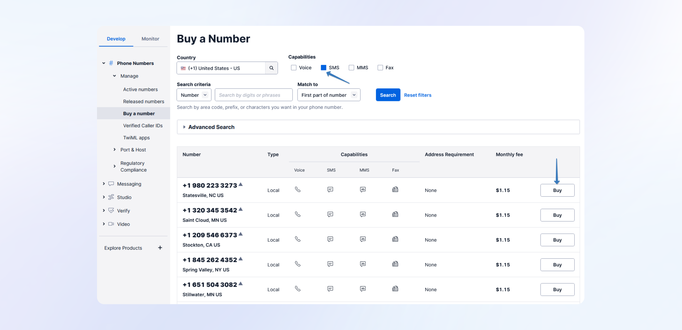 Для подключения телефонного номера Twilio с функцией SMS необходимо его приобрести. Перейдя на страницу «Купить номер», установите флажок «SMS» и нажмите «Поиск».