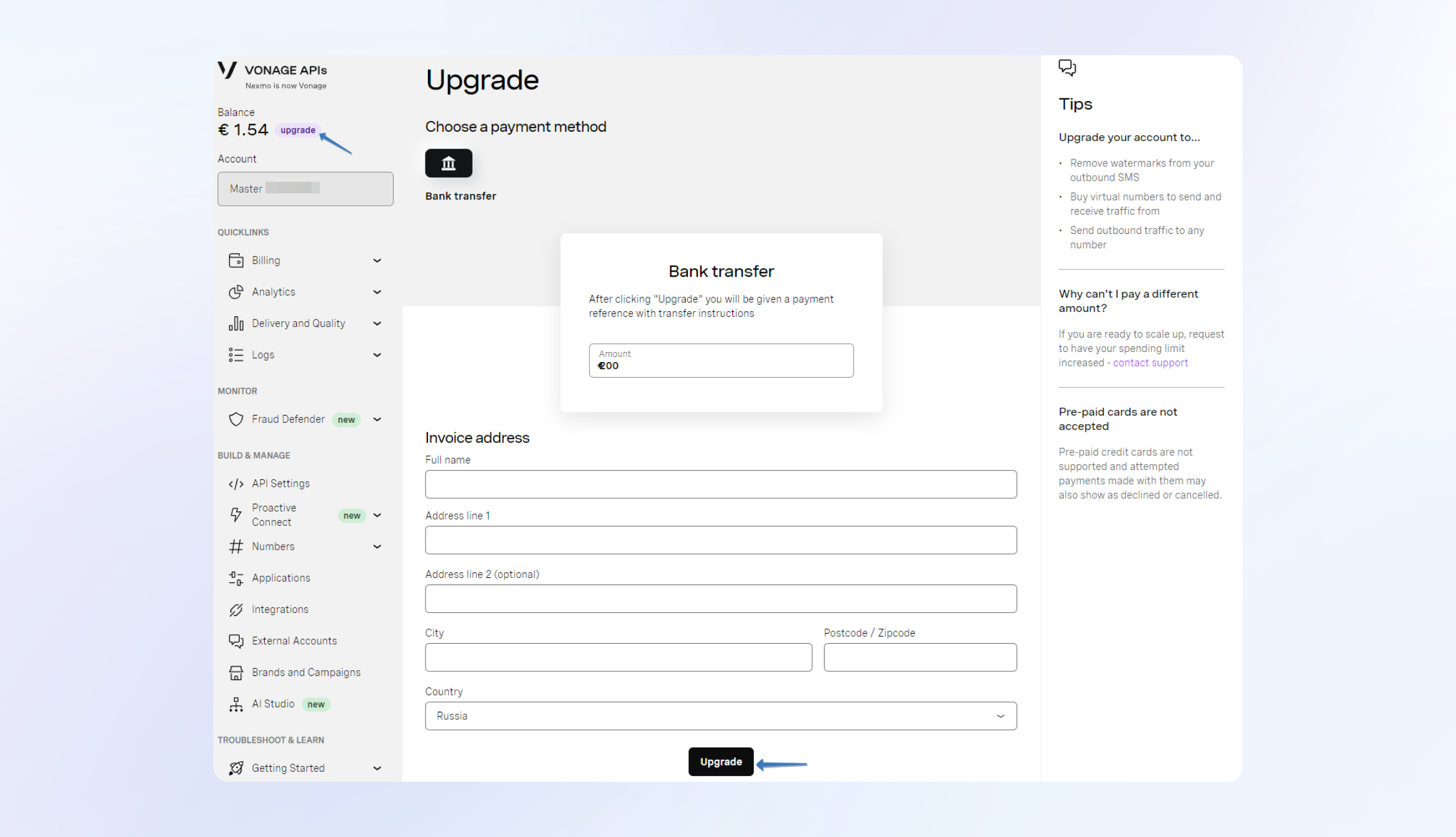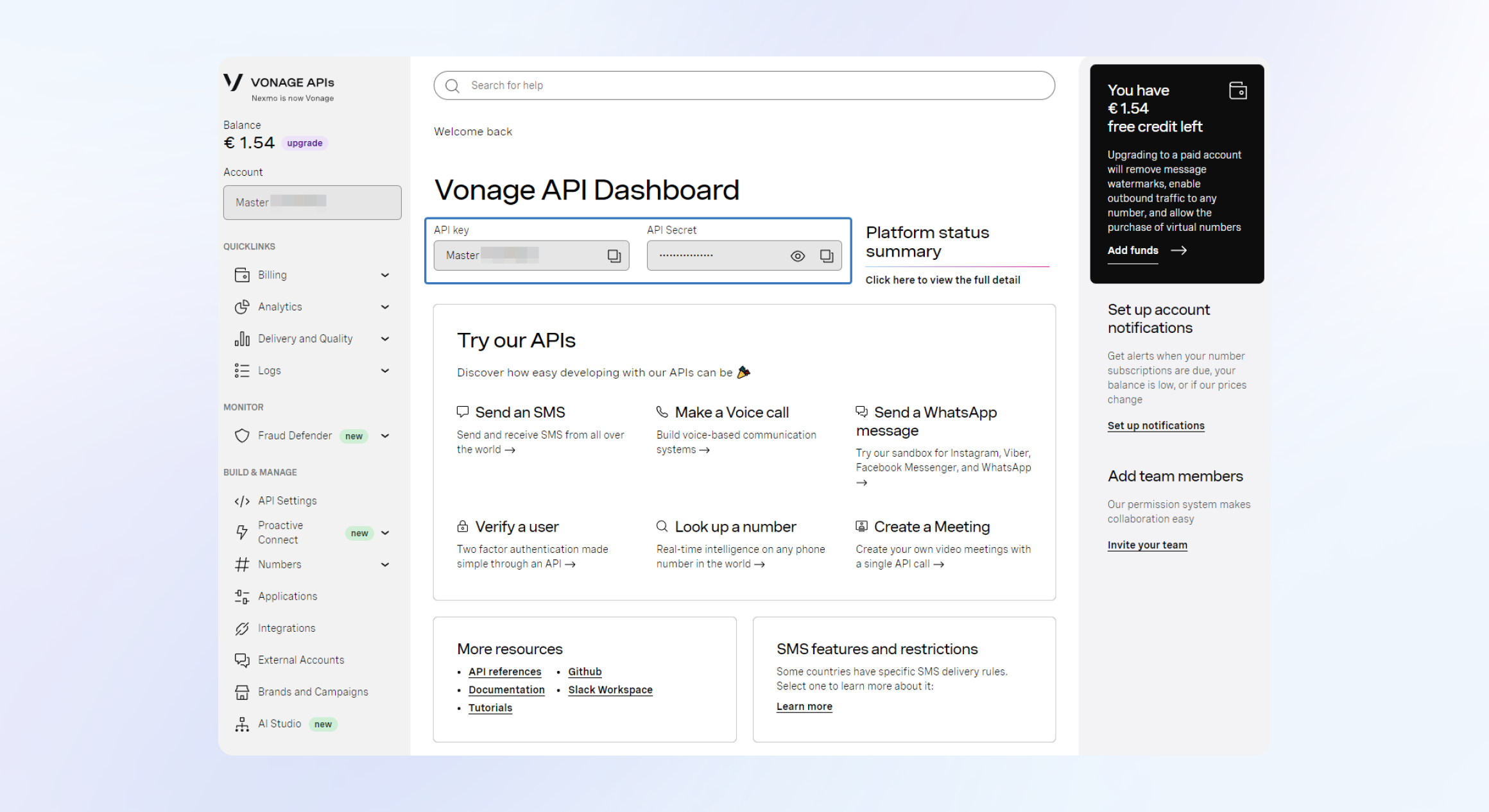 Шаг 5: Получение необходимых данных в личном кабинете Vonage.