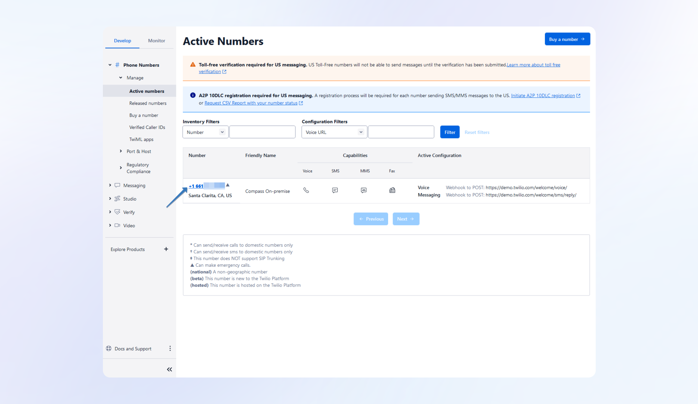 Настройка купленного номера Twilio аналогична настройке тестового номера из шага 2.