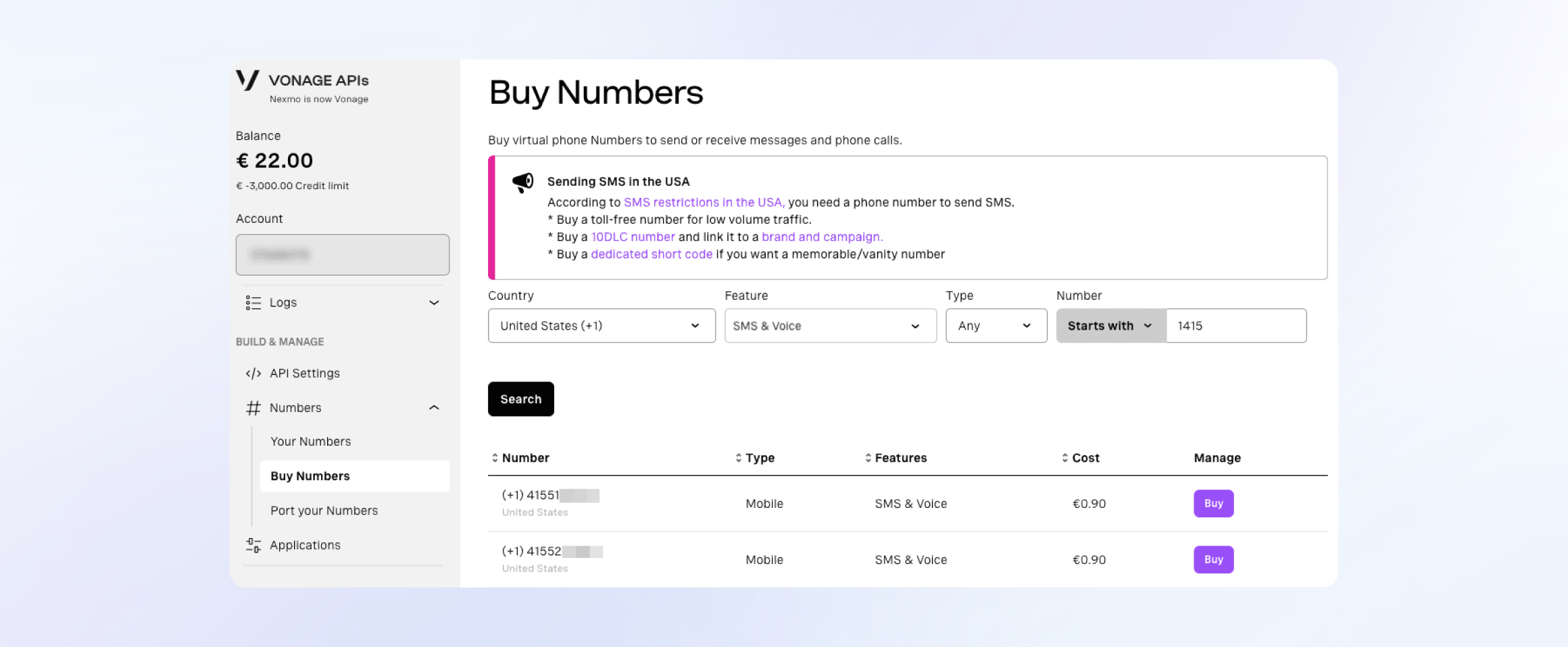 Для подключения телефонного номера Vonage с функцией SMS необходимо его приобрести. Перейдя в раздел Build & Manage на страницу Buy Numbers, установите фильтр «SMS» и нажмите «Поиск».